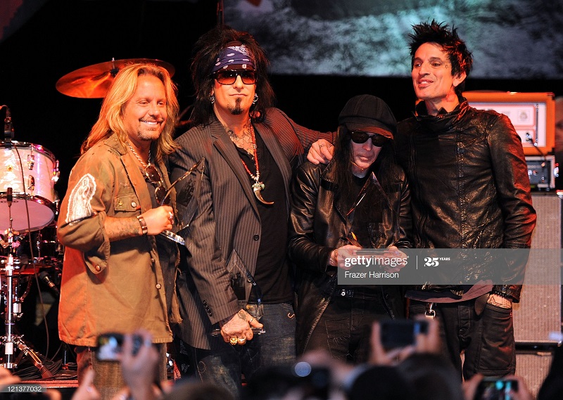 WEST HOLLYWOOD, CA – AUGUST 18: Motley Crue (L-R) Vince Neil, Nikki Sixx, Mick Mars, Tommy Lee with their awards on stage at the the Annual Sunset Strip Music Festival, Tribute to Motley Crue at the House of Blues Sunset Blvd on August 18, 2011 in West Hollywood, California. (Photo by Frazer Harrison/Getty Images)